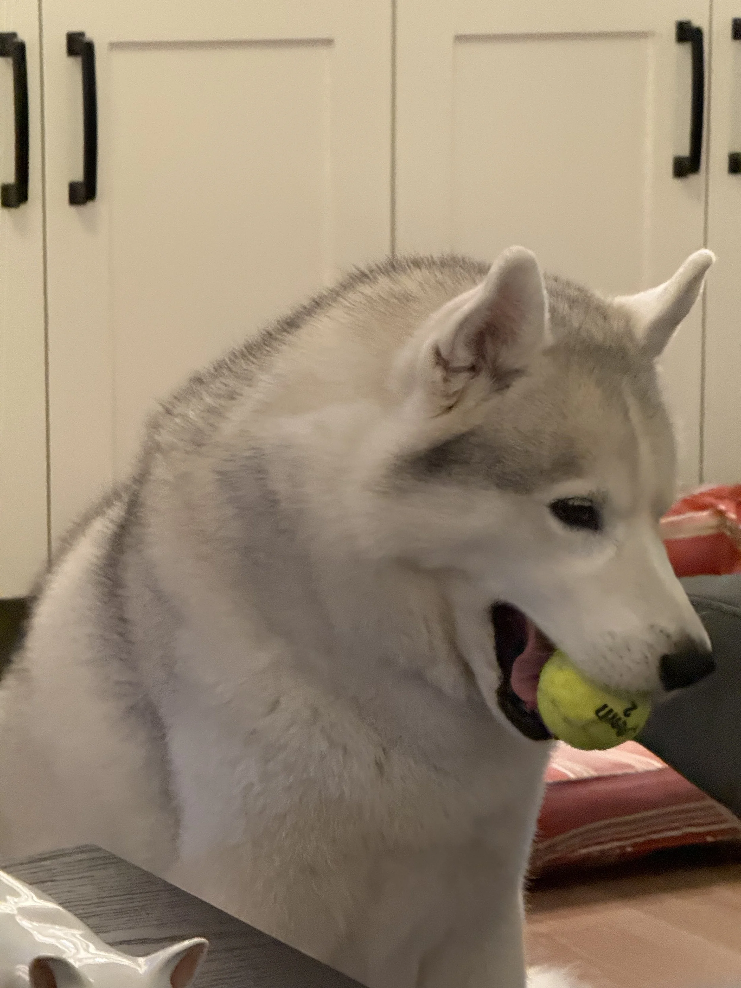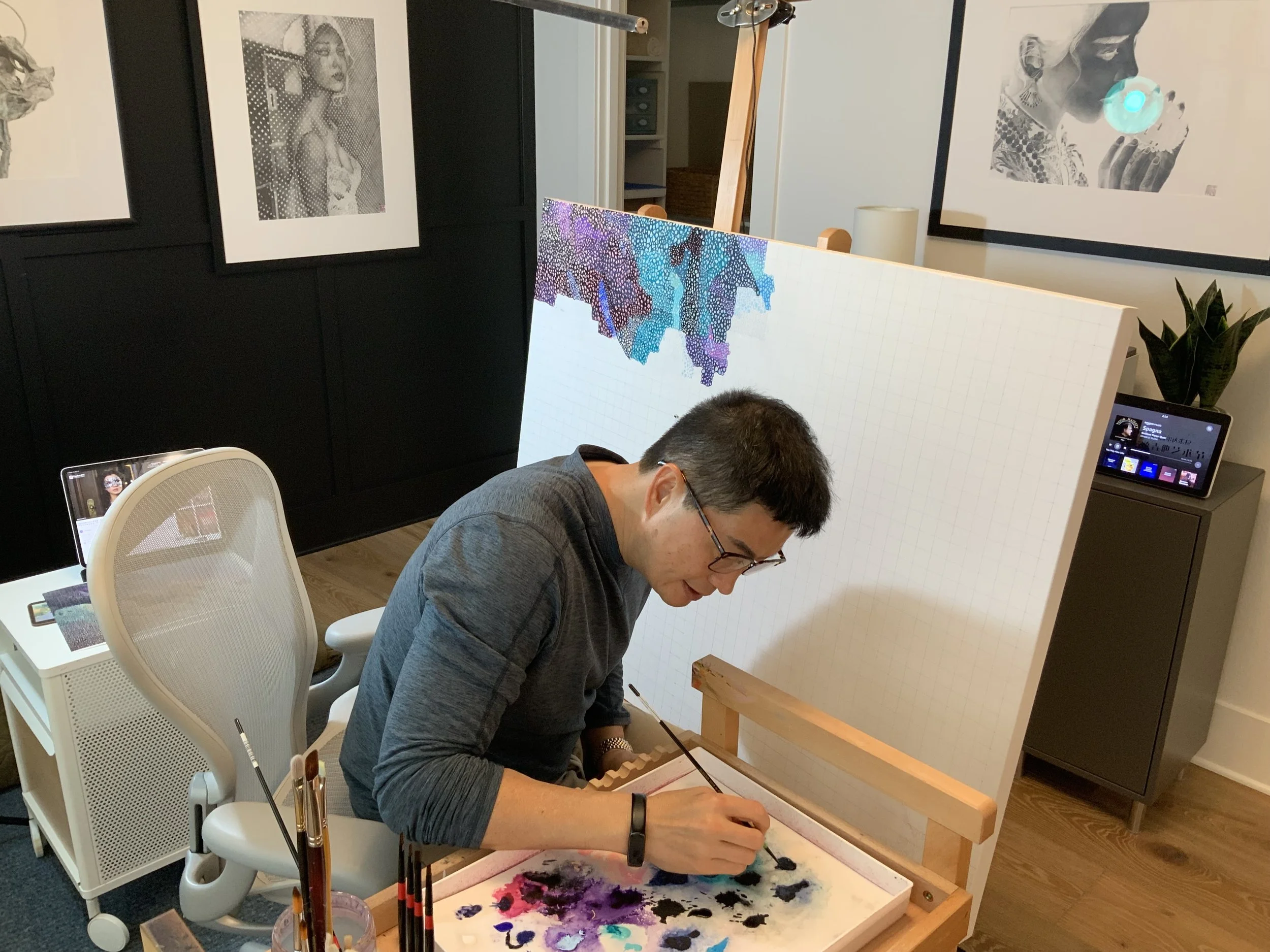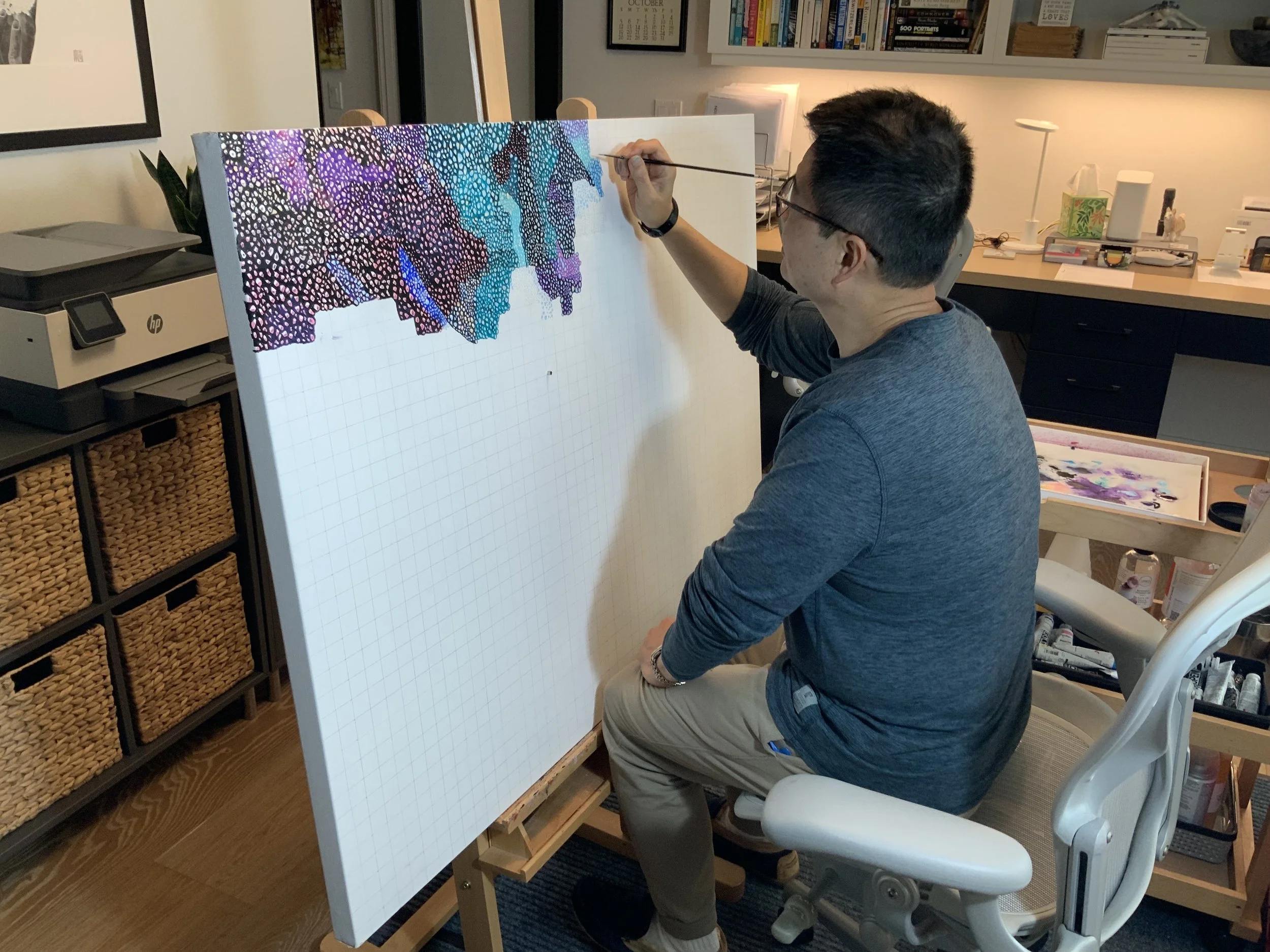 My latest work in progress…an acrylic painting, 48x36. It is an original abstract piece inspired by traditional Australian Aboriginal paintings ; it’s still early days for this work, so it’s still untitled. I’ll share updates as I progress with the work. I hope you’ll like it. As usual, I have to include a photo of DiDi, our Siberian husky. He always keeps me company while I’m painting!