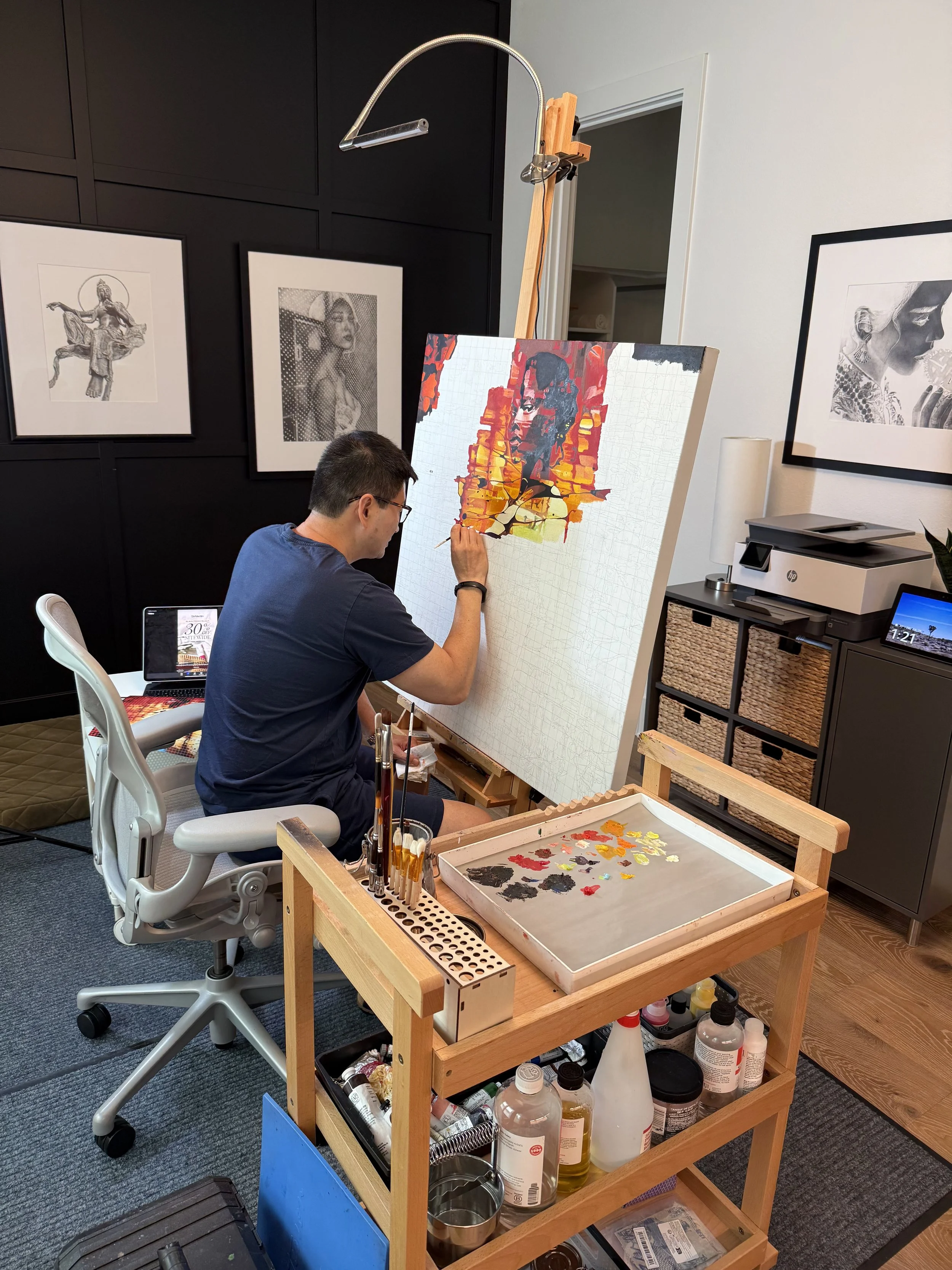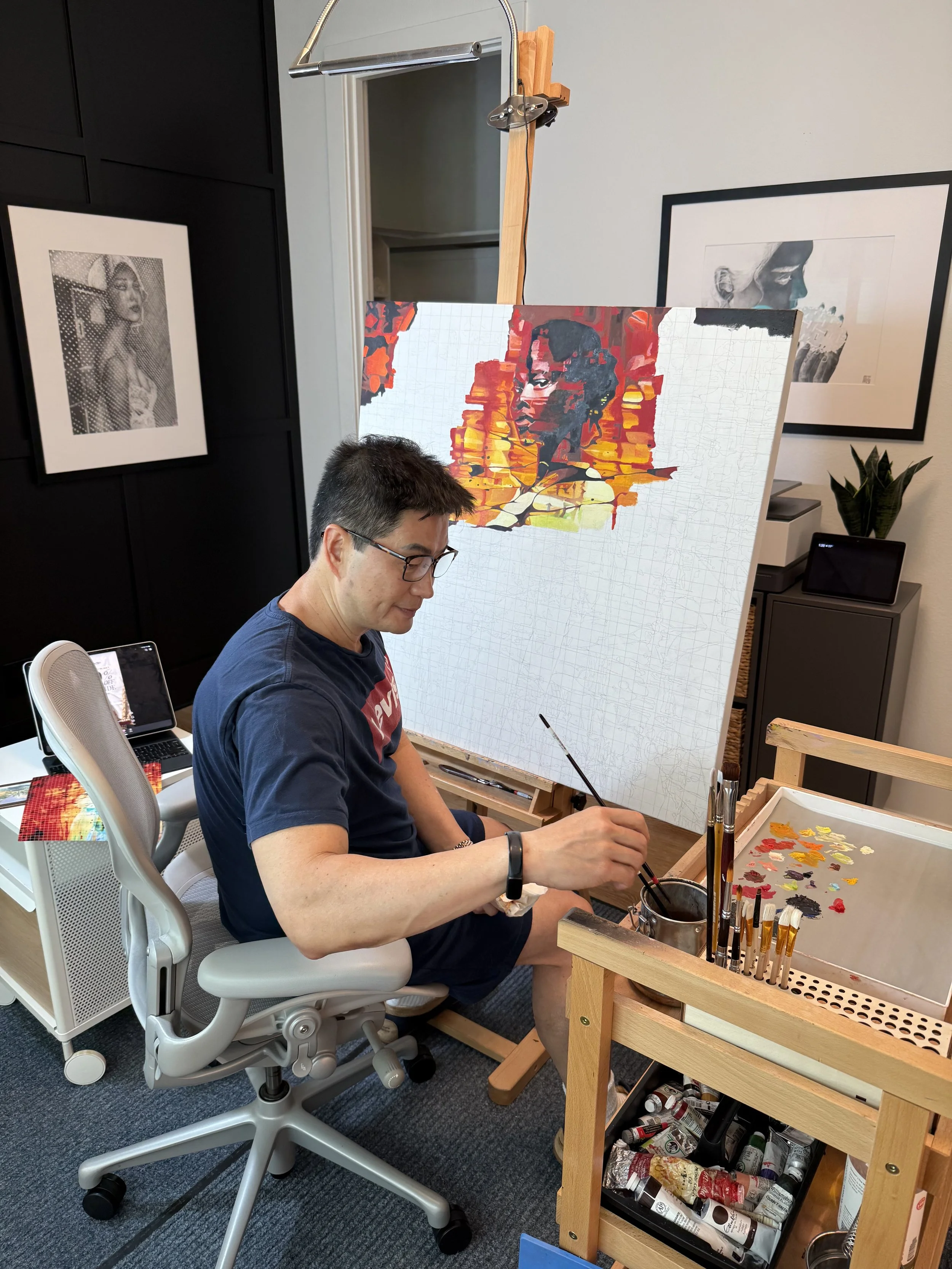 My latest work in progress…an oil painting, 36x36. It is a figurative abstract based on a design I created; it’s still early days for this work, so it’s still untitled. I expect this to evoke strong feelings in the viewer. I’ll share updates as I progress with the work. I hope you’ll like it. As usual, I have to include a photo of DiDi, our Siberian husky. He always keeps me company while I’m painting!